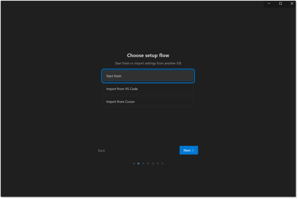 既にVS CodeやCursorを使っていて設定を引き継ぎたい場合を除き、「Start fresh」を選択しましょう。