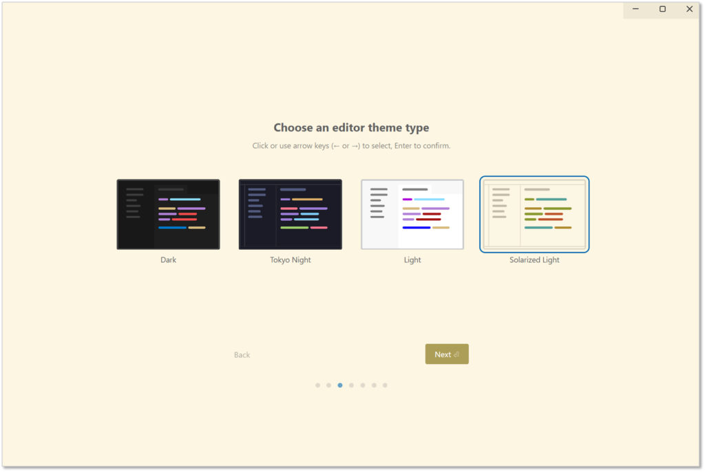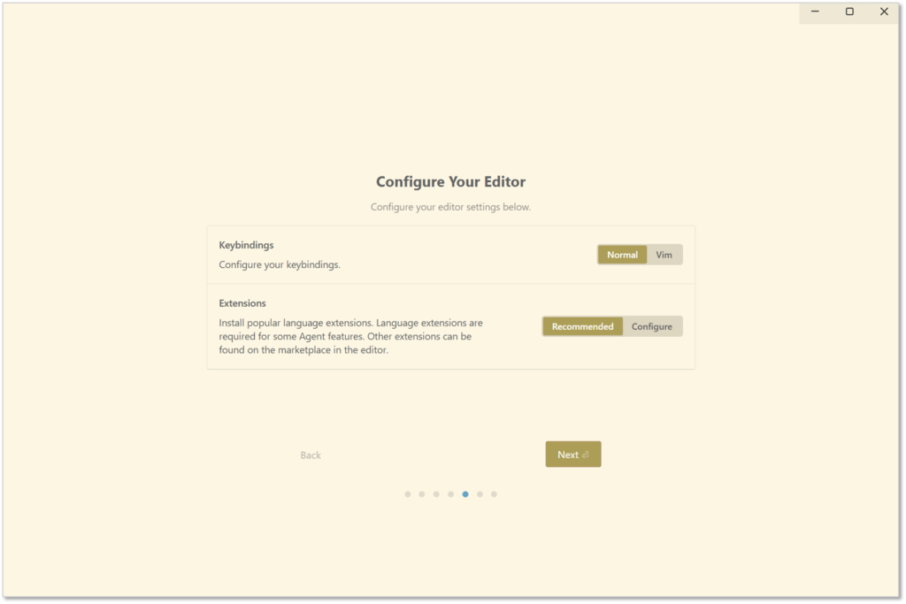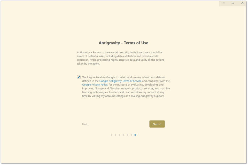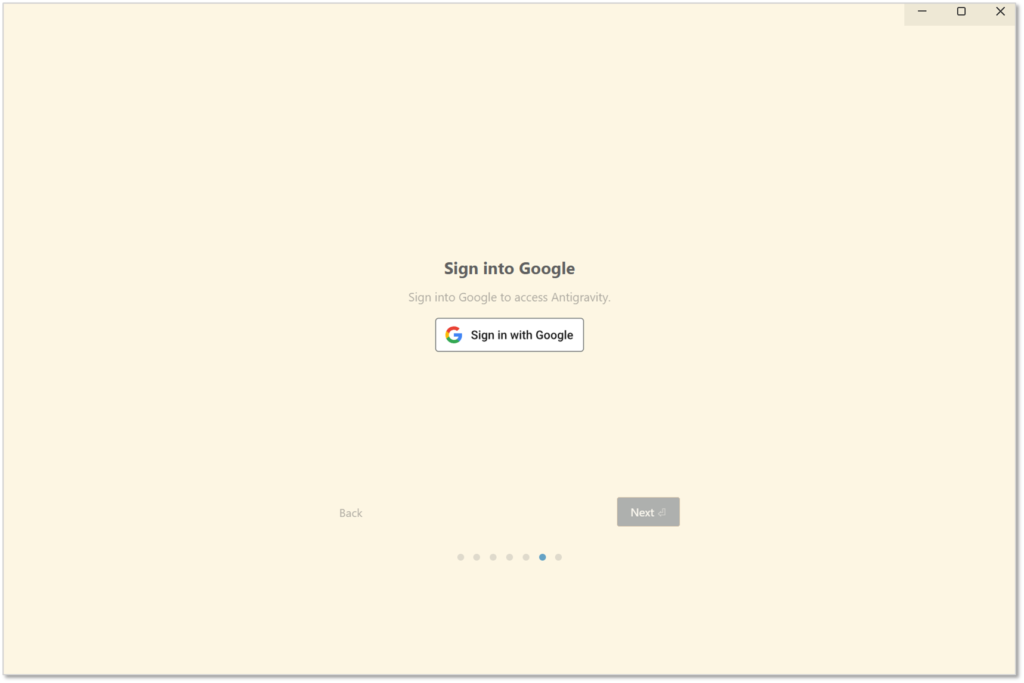 Antigravityが立ち上がったら、「Next」から初期設定を進めていきましょう。