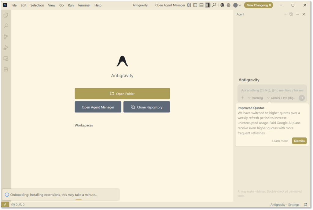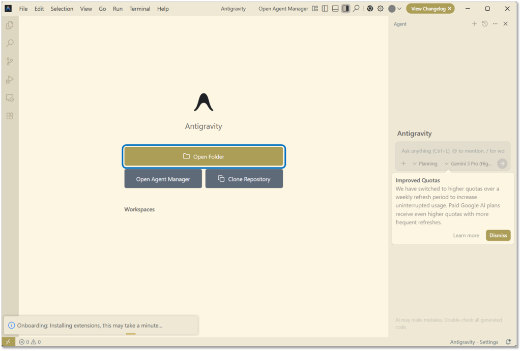Antigravityの画面が表示されたら、設定は完了です。