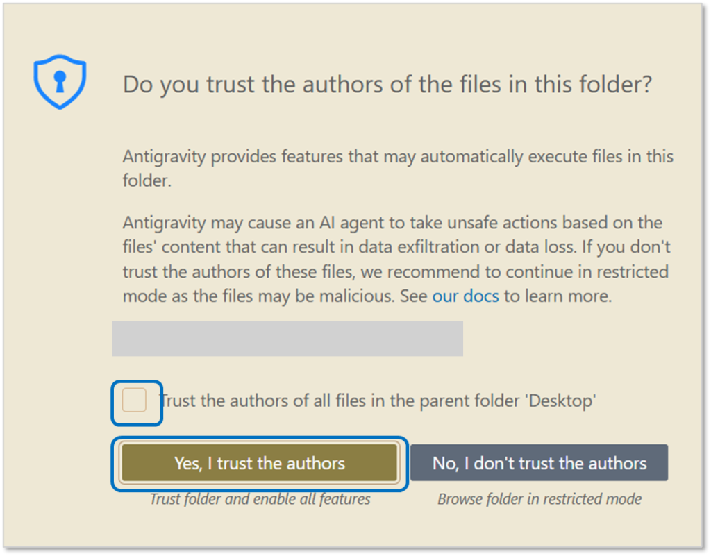 Antigravityでフォルダやファイルと連携する際、以下の画面が表示されることがあります。