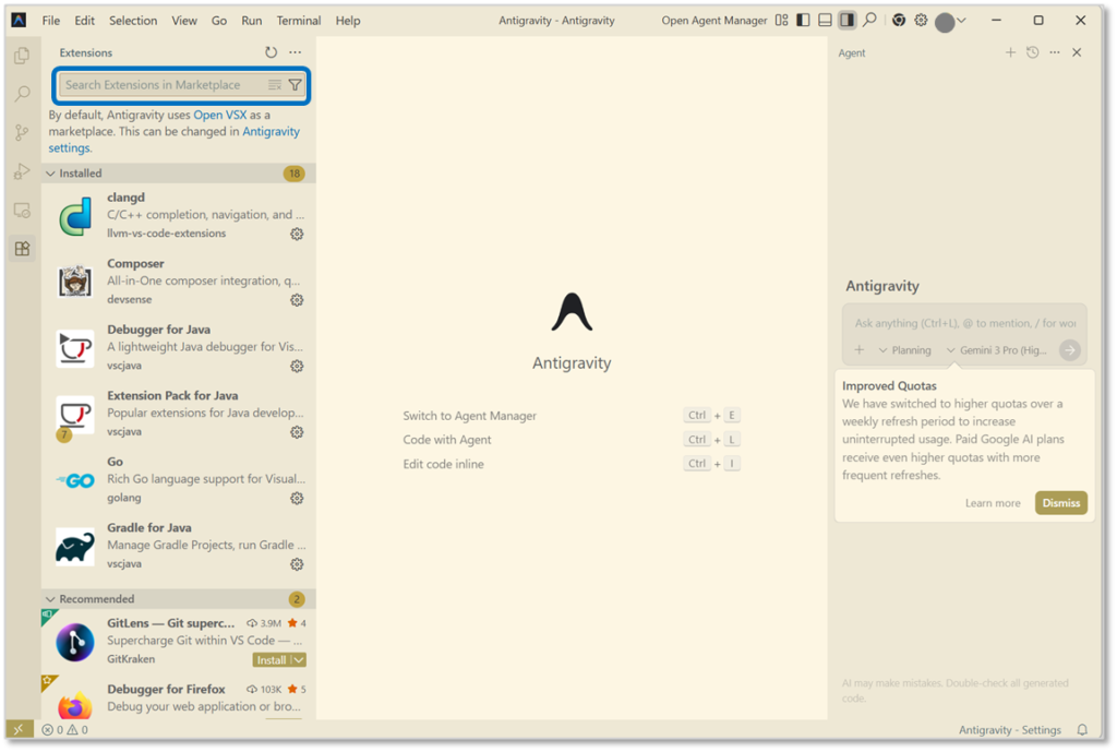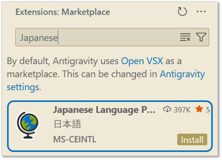 Antigravity上でキーボードの「Ctrk+Shift+X」を押し、拡張機能リストを開きます。