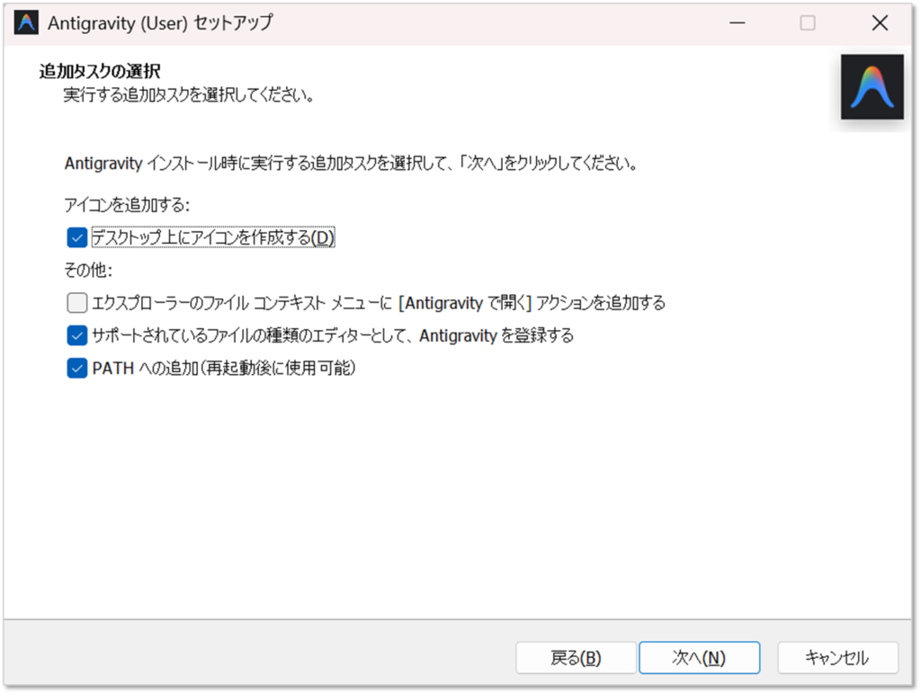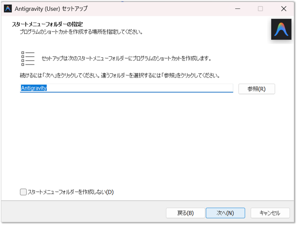 Antigravity.exeファイルをダブルクリックしてインストールを開始します。