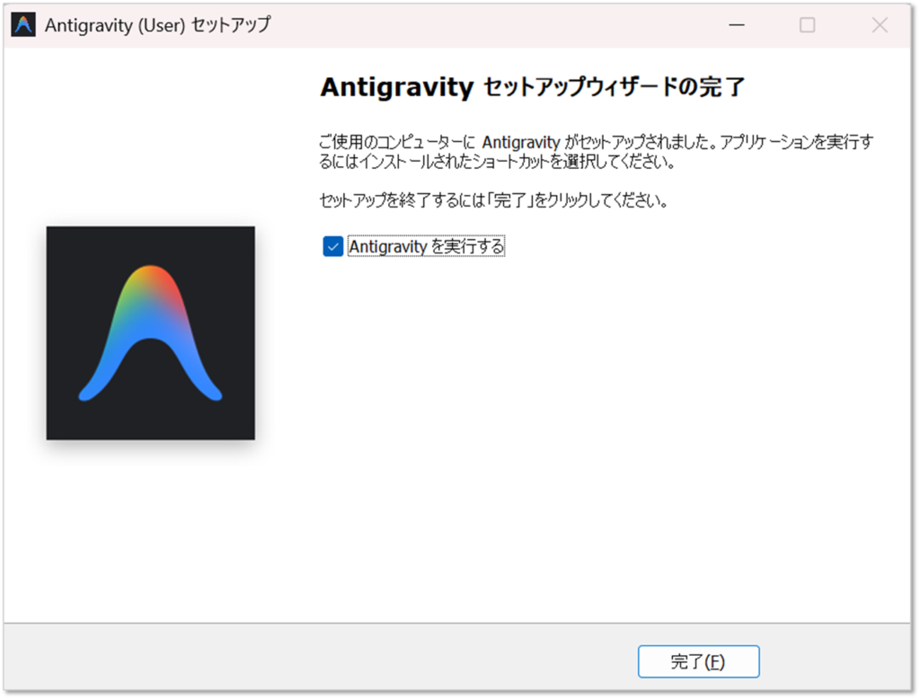 インストールが完了したら「Antigravityを起動する」にチェックを入れて、早速立ち上げてみましょう。