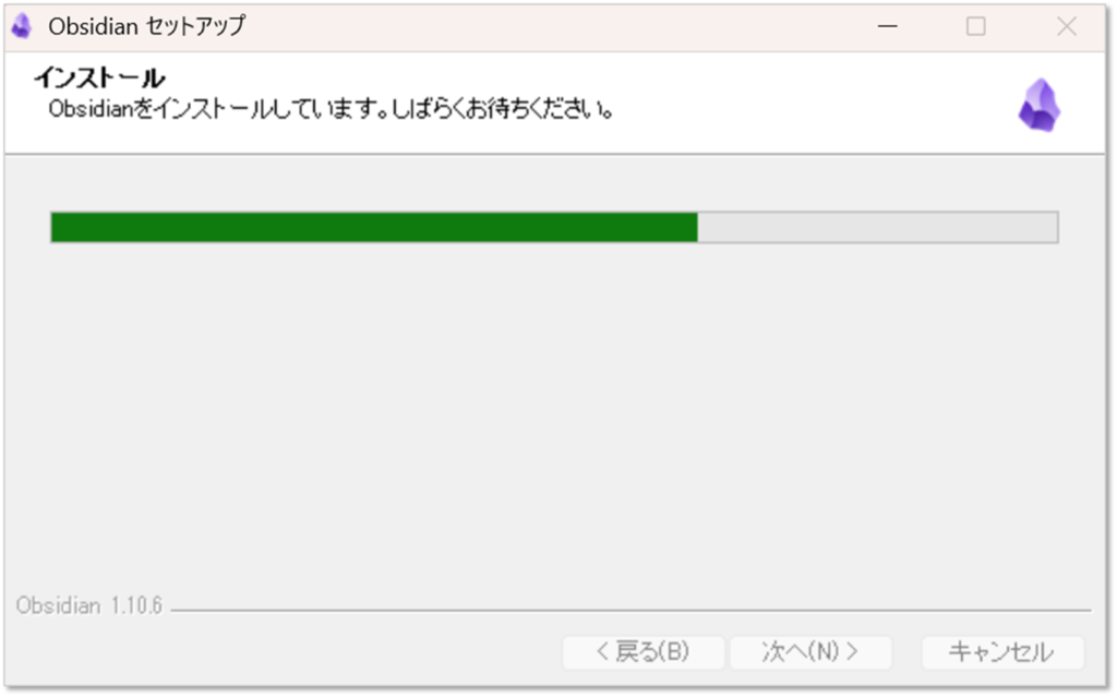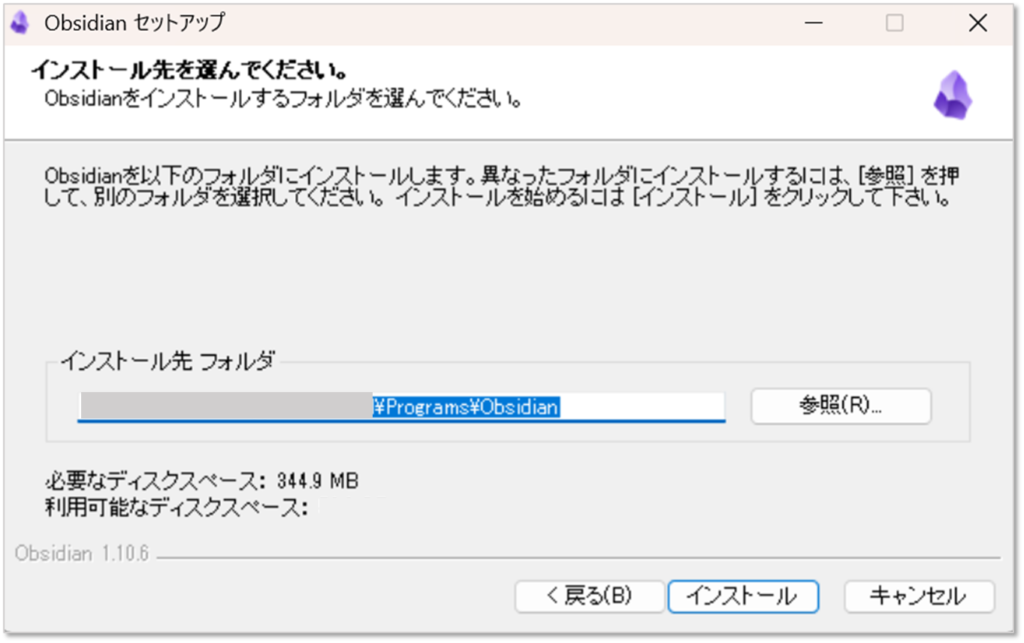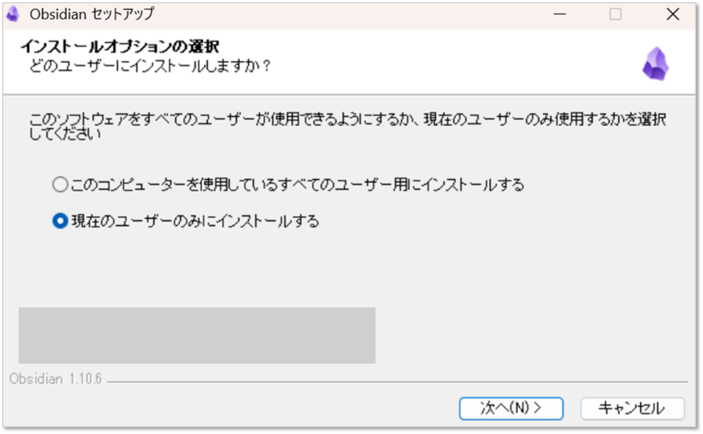 Obsidian-XX.XX.XX.exeファイルをダブルクリックしてインストールを開始します。