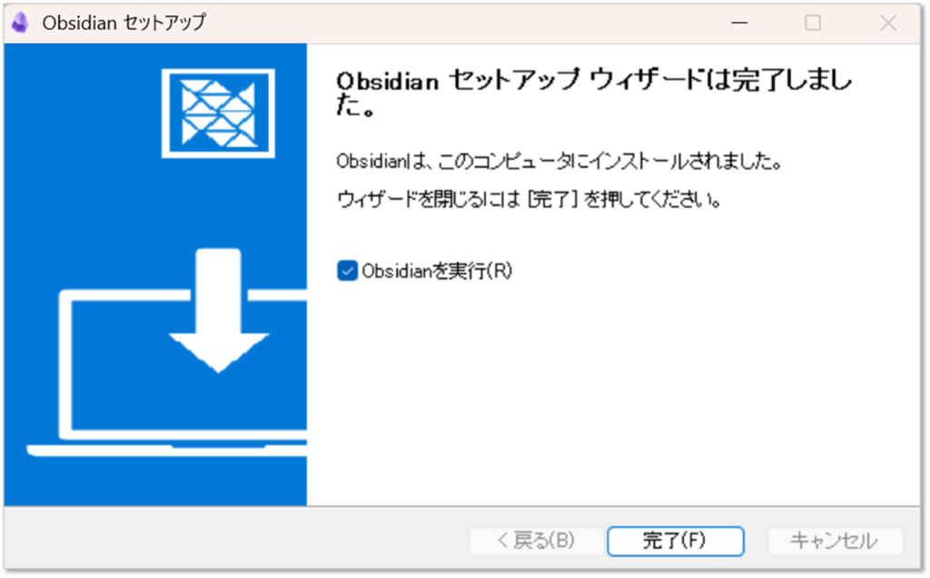 「Obsidianを実行」にチェックを入れたままにしましょう。