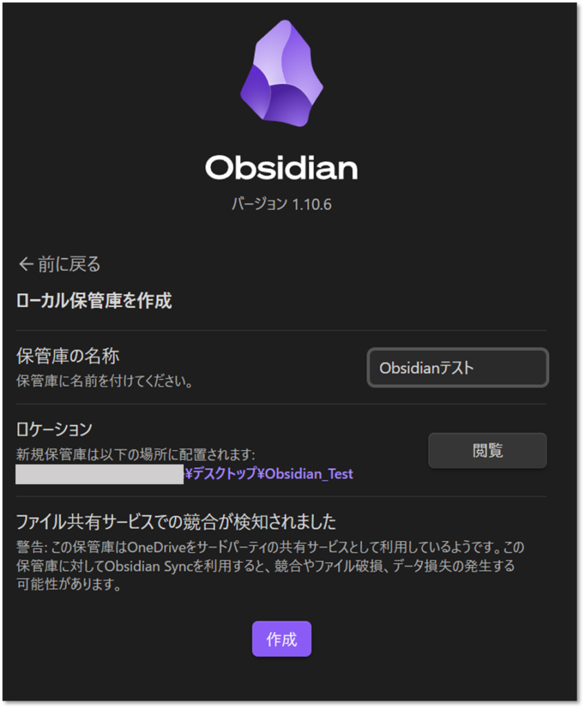 ロケーション:デスクトップ上に配置した「Obsidian_Test」をVaultとして指定